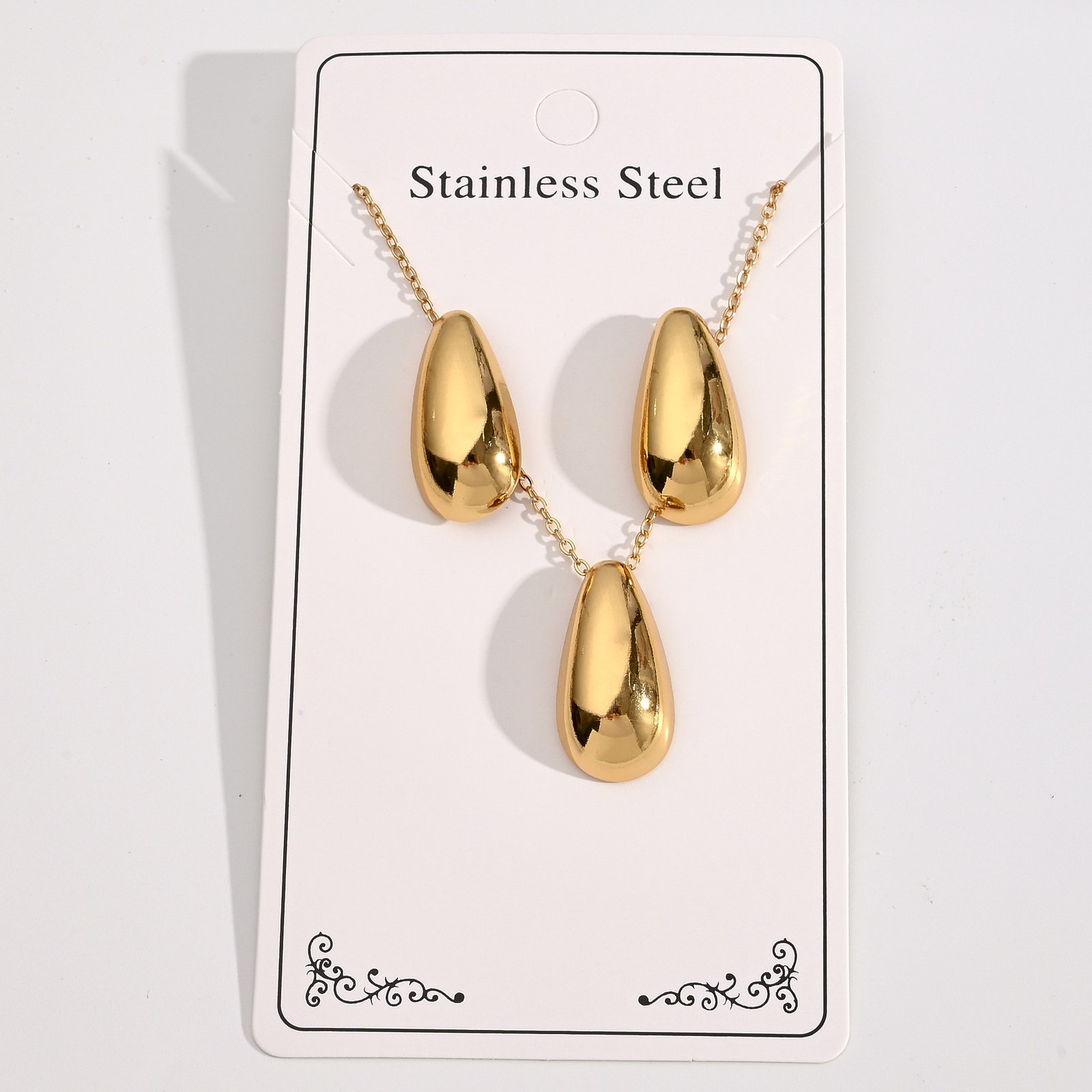 Sé el primero en valorar “Conjunto de collar y pendientes de acero inoxidable 304 chapado en oro con forma de rombo, espiral y gota de agua”